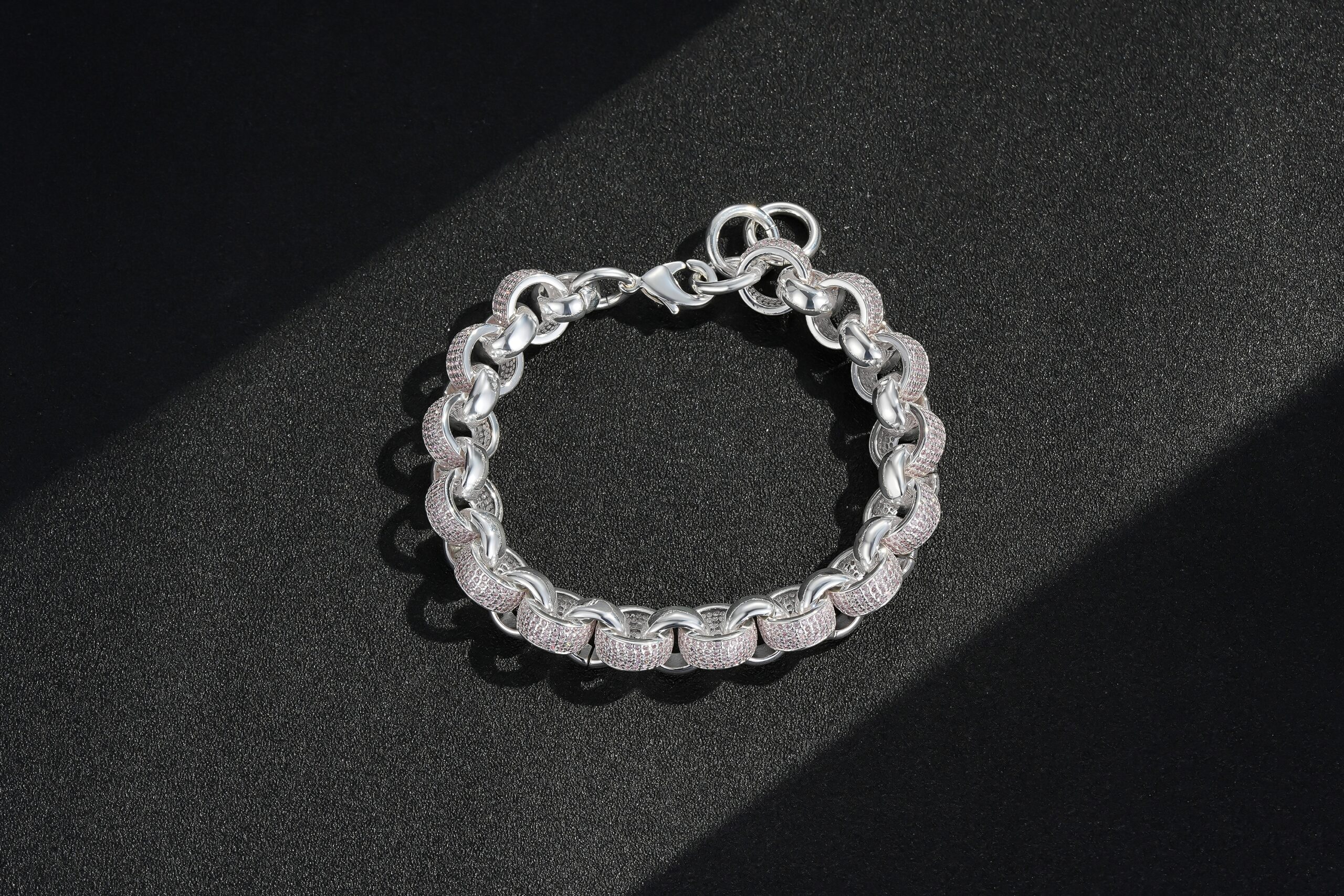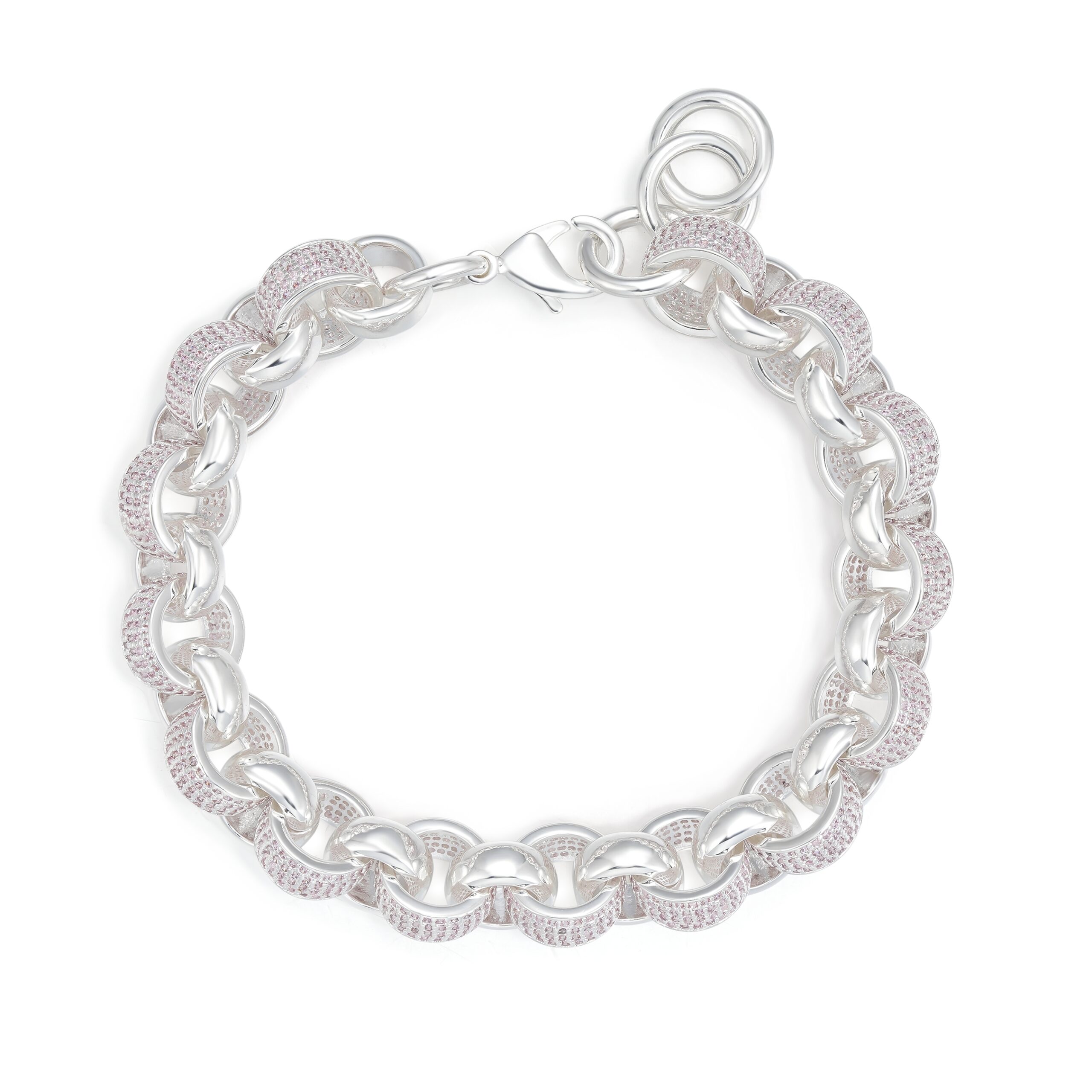 A bold 12mm bracelet featuring a rhodium-plated finish and intricate pink stone accents.