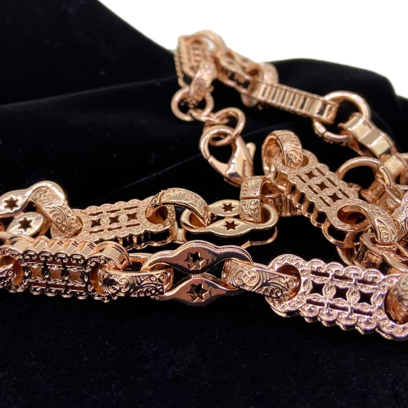 Embrace bold luxury with this intricately designed 12mm chunky stars and bars necklace in premium rose gold. The highly detailed links feature a unique engraved pattern, giving the piece a vintage yet modern appeal. Ideal for those who love to make a statement, this necklace offers both sophistication and durability, perfect for special occasions or everyday glamour.