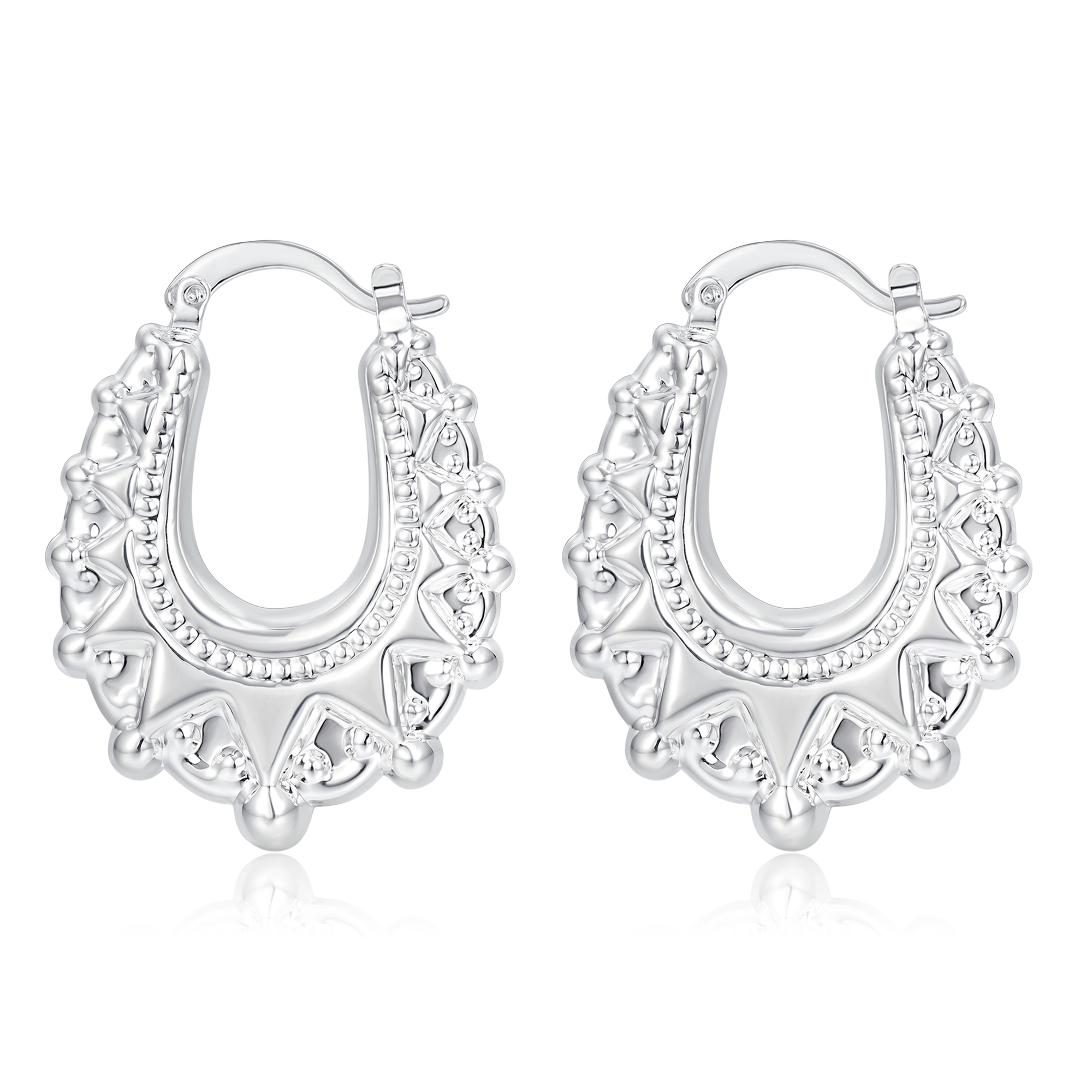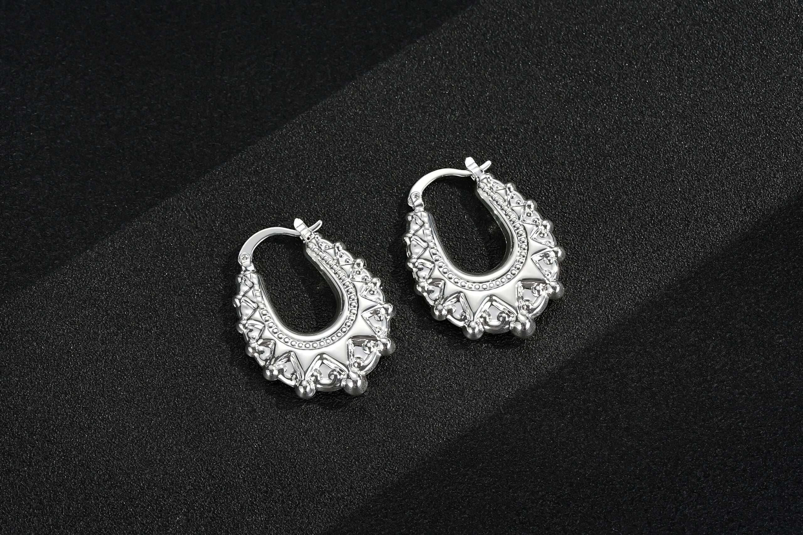 These 3cm silver creole earrings showcase intricate detailing with a bold, vintage-inspired design. Crafted with high-quality silver plating, they provide a stunning shine and a lightweight feel for all-day comfort. The secure lever-back clasp ensures ease of wear, making them a versatile accessory for any occasion.