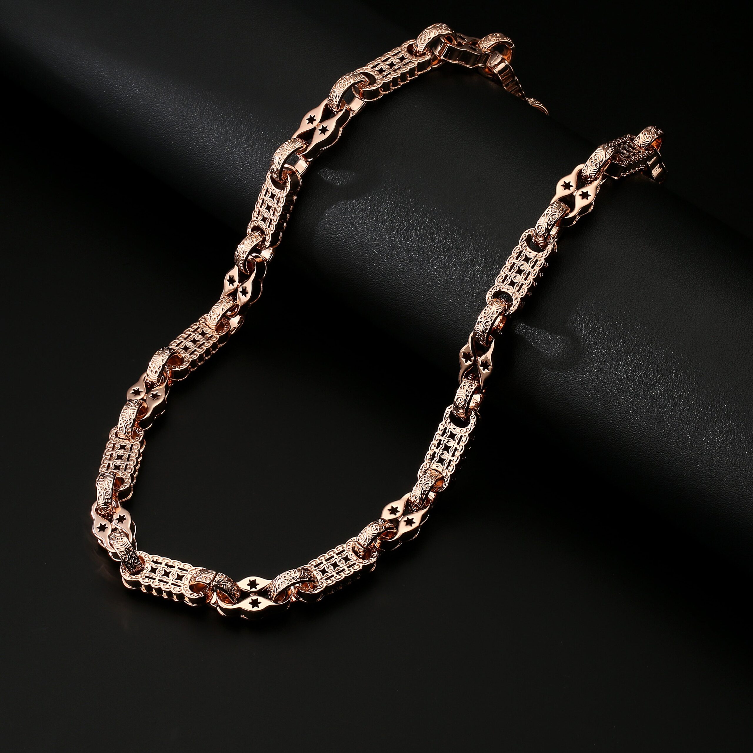 - This luxurious 3D Rose Gold Stars and Bars Chain is designed for those who love bold and elegant jewellery. The chunky and heavy design, crafted with the finest materials, gives it a premium look and feel. Measuring 26 inches in length and 11mm in width, it weighs 196 grams and features a secure lobster claw clasp. Perfect for a sophisticated statement, this chain is both stylish and durable.