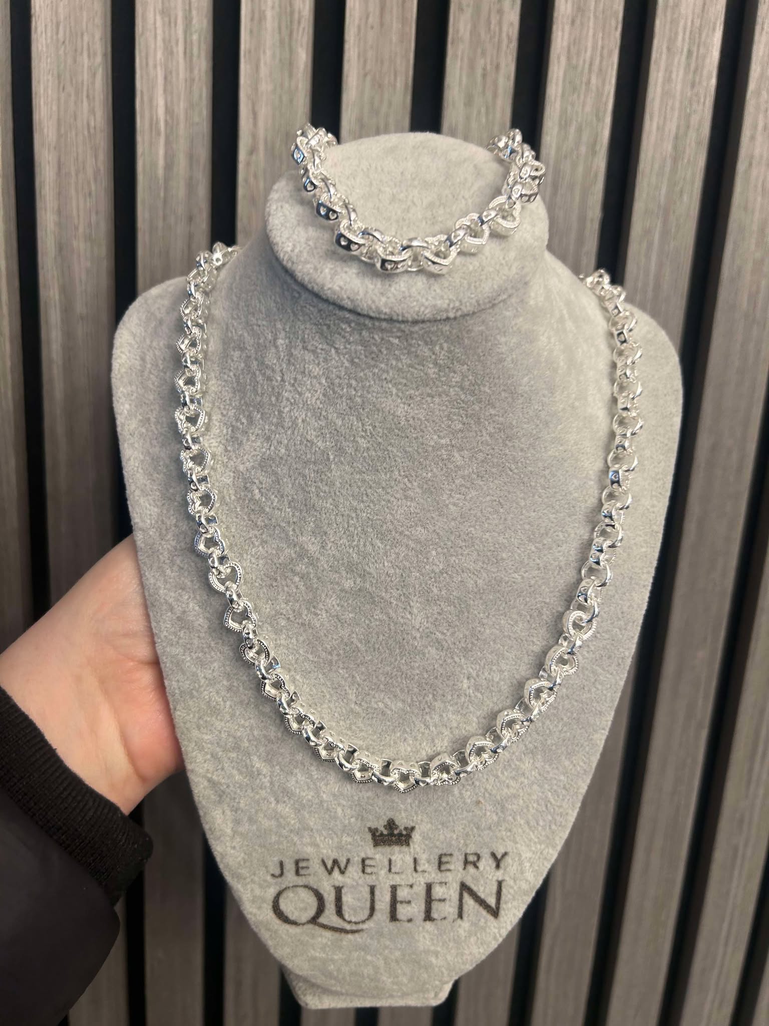 Timeless and romantic, the 8mm Silver Heart Belcher Set features a beautifully crafted necklace and matching bracelet with delicate heart-shaped links. Perfect for adding elegance and charm to any look, this set is made from high-quality silver, ensuring a radiant finish and lasting durability. Whether for everyday wear or special occasions, this set is a versatile and sophisticated choice.