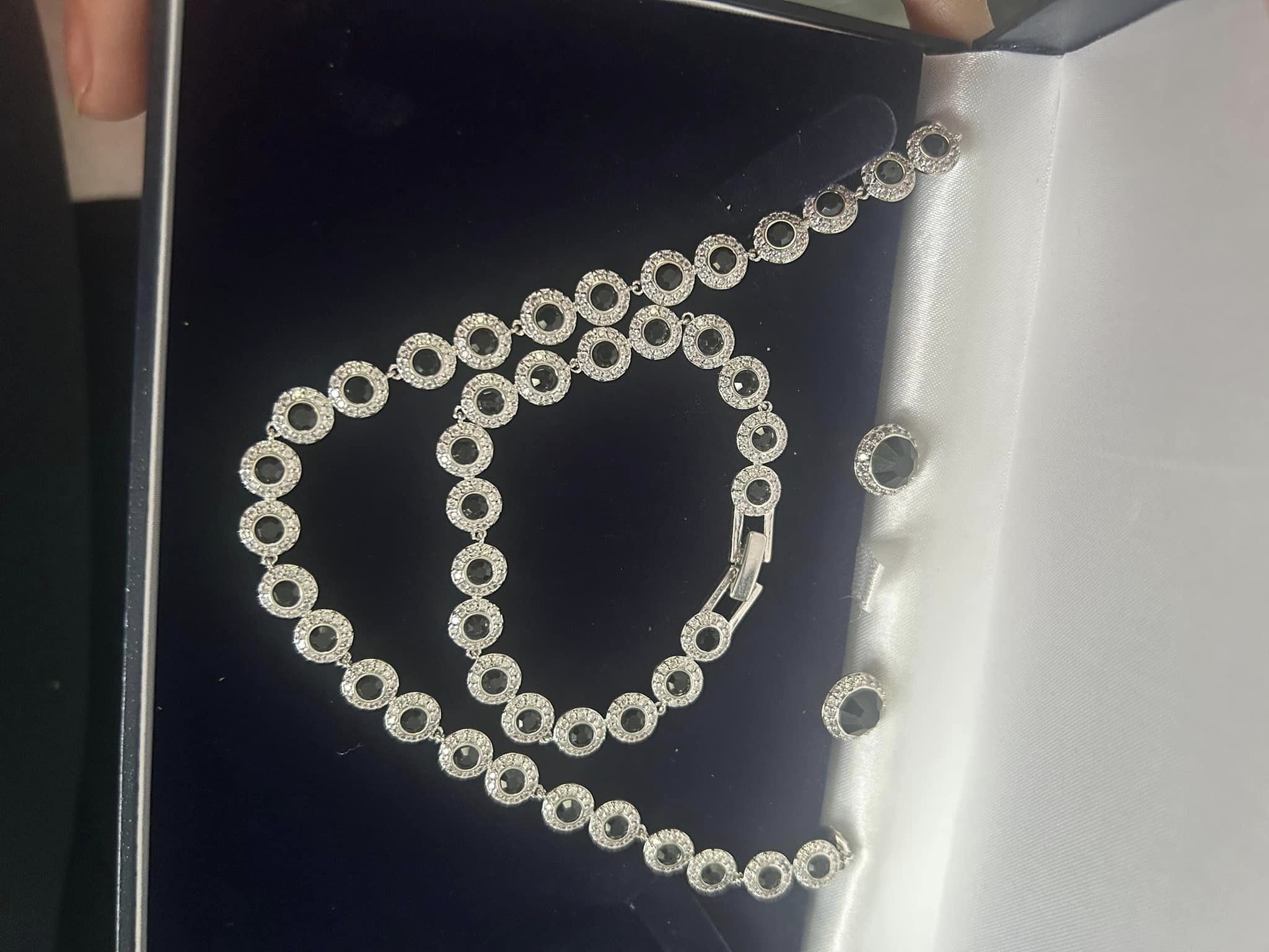 Enhance your style with this exquisite Black Stone Crystal Halo Tennis Set. Featuring sleek black stones surrounded by brilliant halos of clear crystals, this set offers a modern twist on the classic tennis design. Perfect for both everyday elegance and special occasions, it includes a coordinating necklace and bracelet that add a touch of sophistication to any look.