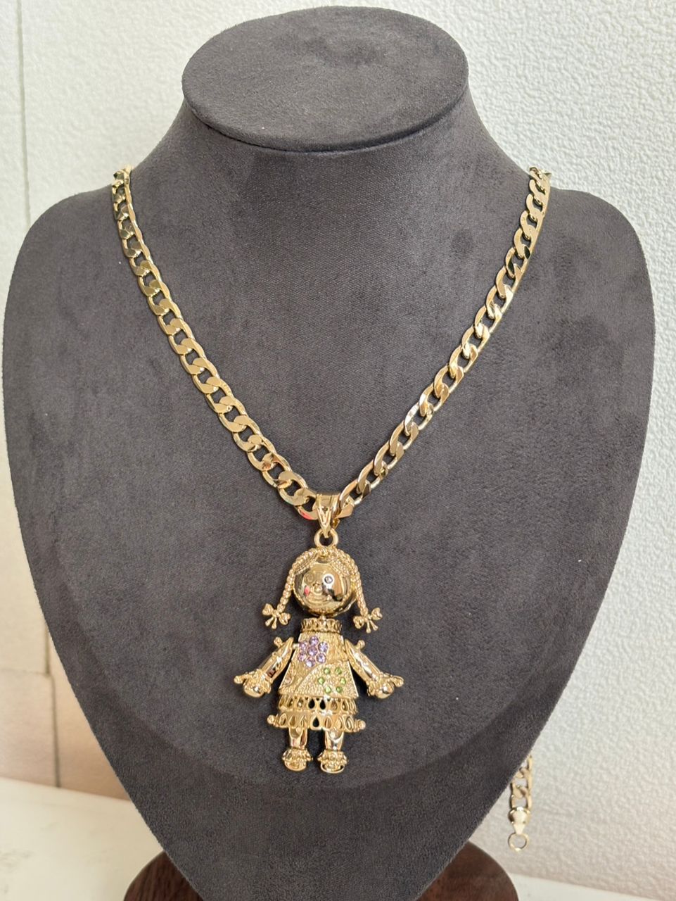 Make a unique statement with this charming gold-toned ragdoll pendant necklace. Featuring intricate detailing and a playful yet elegant design, this piece is perfect for those who love distinctive jewellery with character.