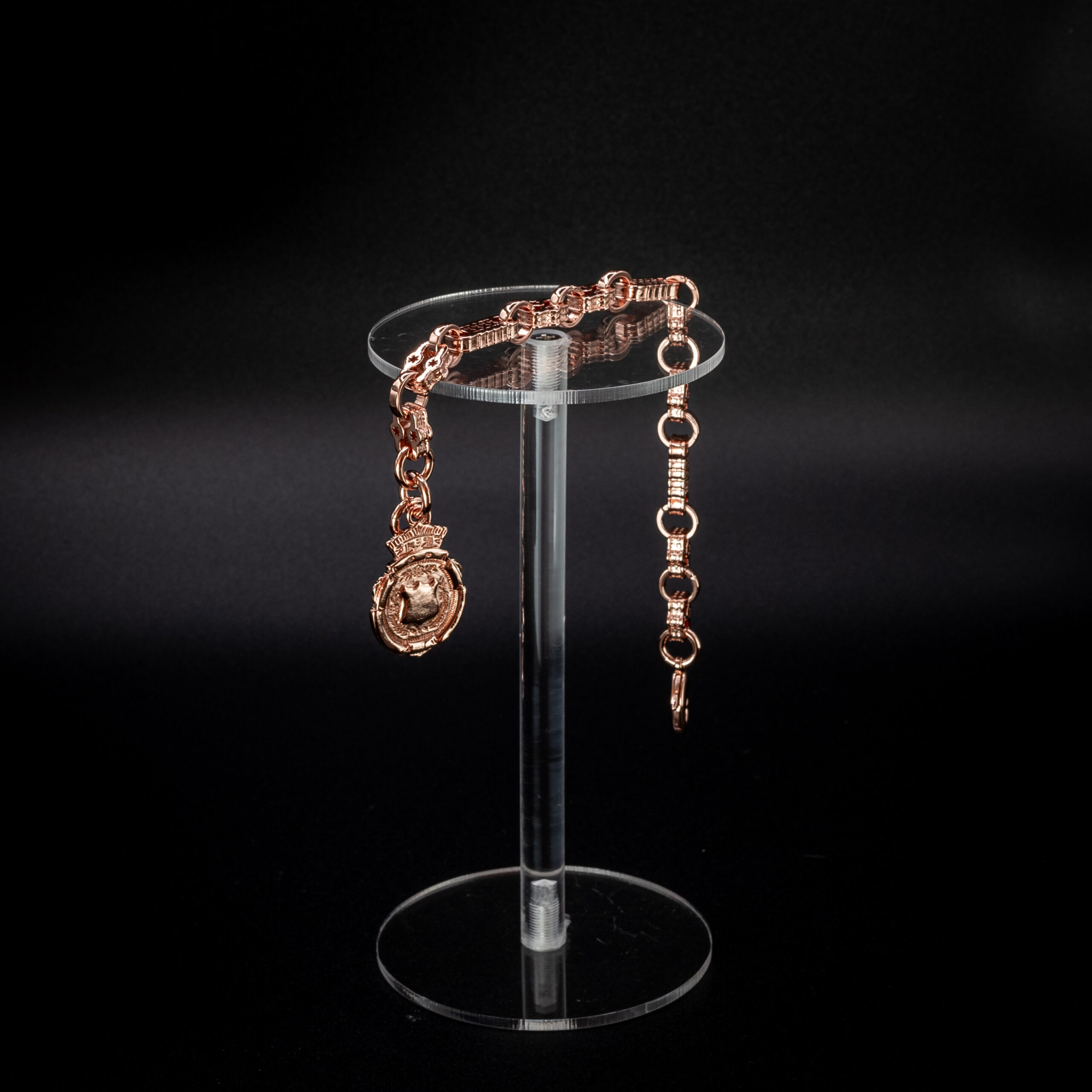 This elegant rose gold-filled bracelet features a 7mm medium stars and bars design, highlighted by a distinctive shield pendant. The rose gold finish adds warmth and sophistication, making it a versatile piece for both everyday wear and special occasions. The intricate detailing and polished look offer a refined touch to any outfit.