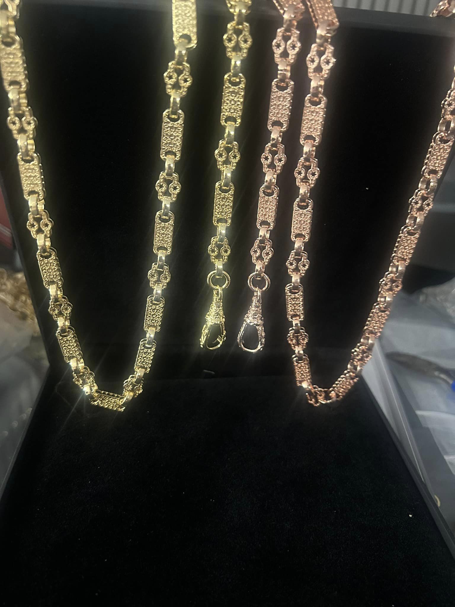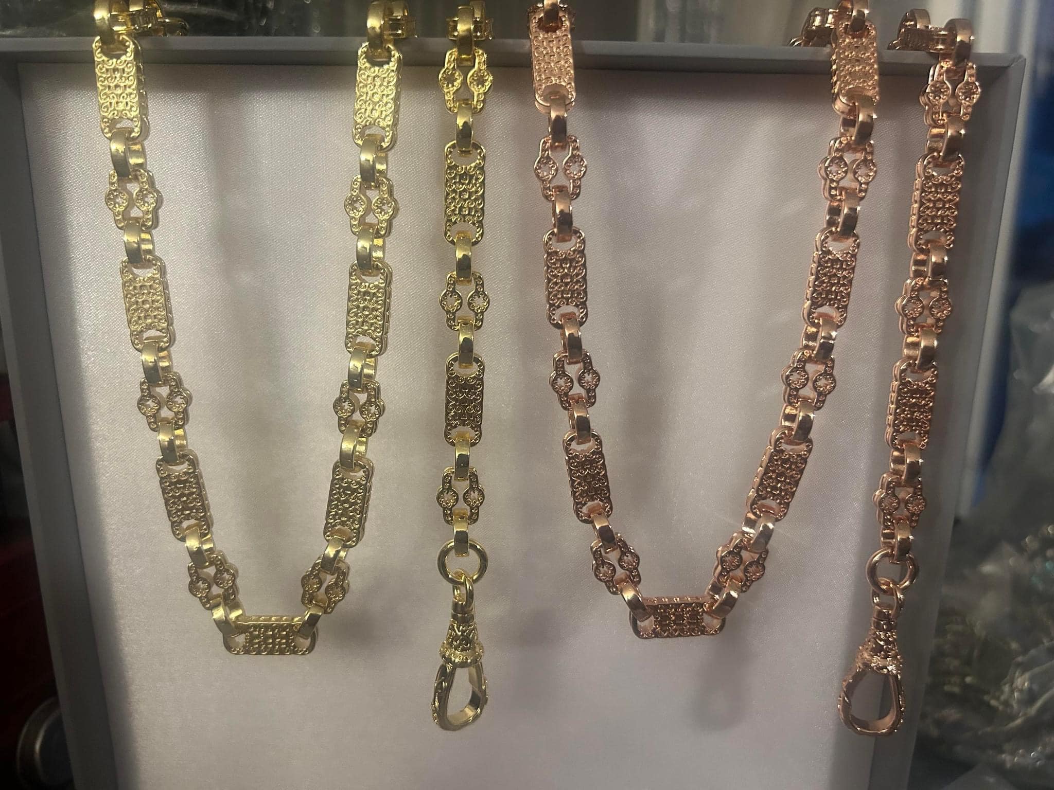 Add a touch of elegance with this Medium Patterned Stars and Bars Set in a luxurious rose gold finish. The intricate stars and bars design, coupled with delicate patterns, creates a unique and eye-catching look. Perfect for those who appreciate fine details, this set includes a stylish necklace and bracelet for a coordinated, sophisticated appearance.