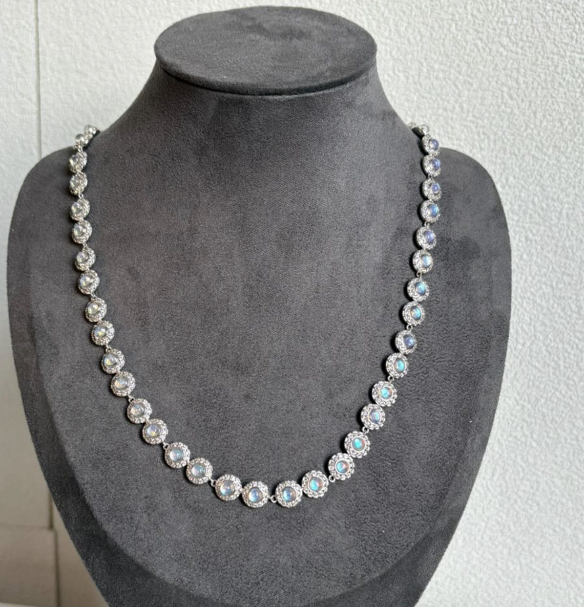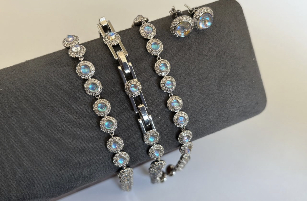 - Includes a moonstone tennis bracelet, matching necklace, and earrings.
