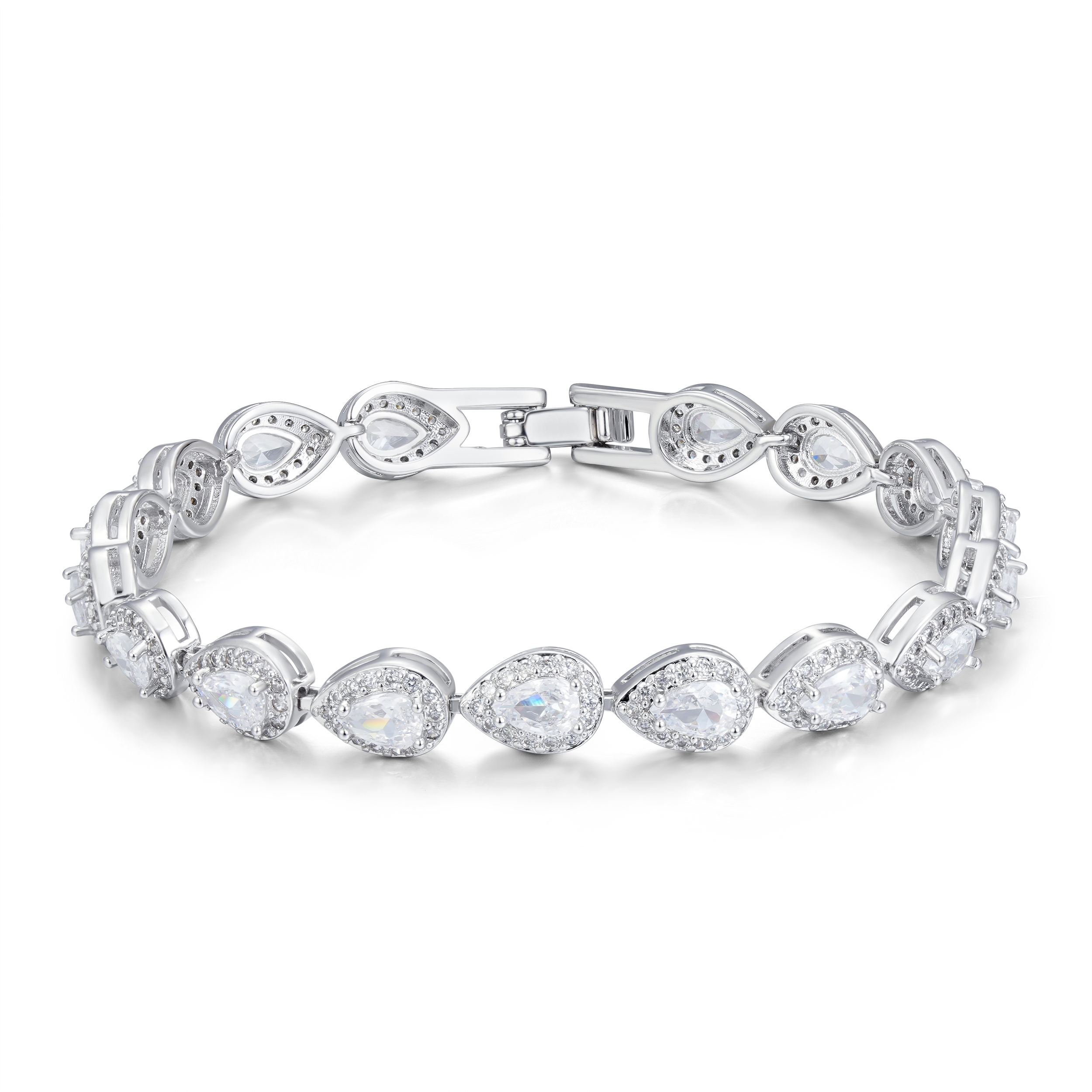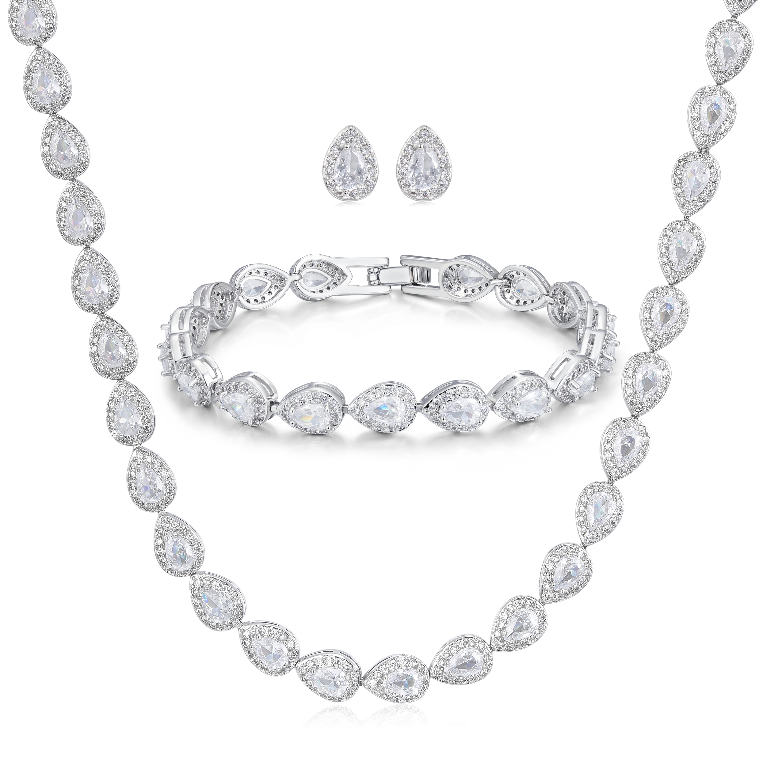 Elevate your style with this elegant silver teardrop tennis set. Featuring a matching necklace, bracelet, and earrings with shimmering teardrop designs, this rhodium-plated set exudes timeless sophistication. Includes extenders for a customizable fit.