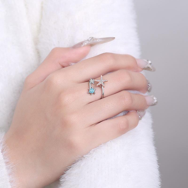 Dive into elegance with the Ocean Treasures Ring, a whimsical piece inspired by the beauty of the sea. Featuring a sparkling rose gold starfish adorned with crystals and a vibrant blue turtle charm, this ring is the perfect blend of charm and sophistication. Its adjustable silver band ensures a comfortable fit, making it ideal for ocean lovers and those seeking a playful yet refined accessory.