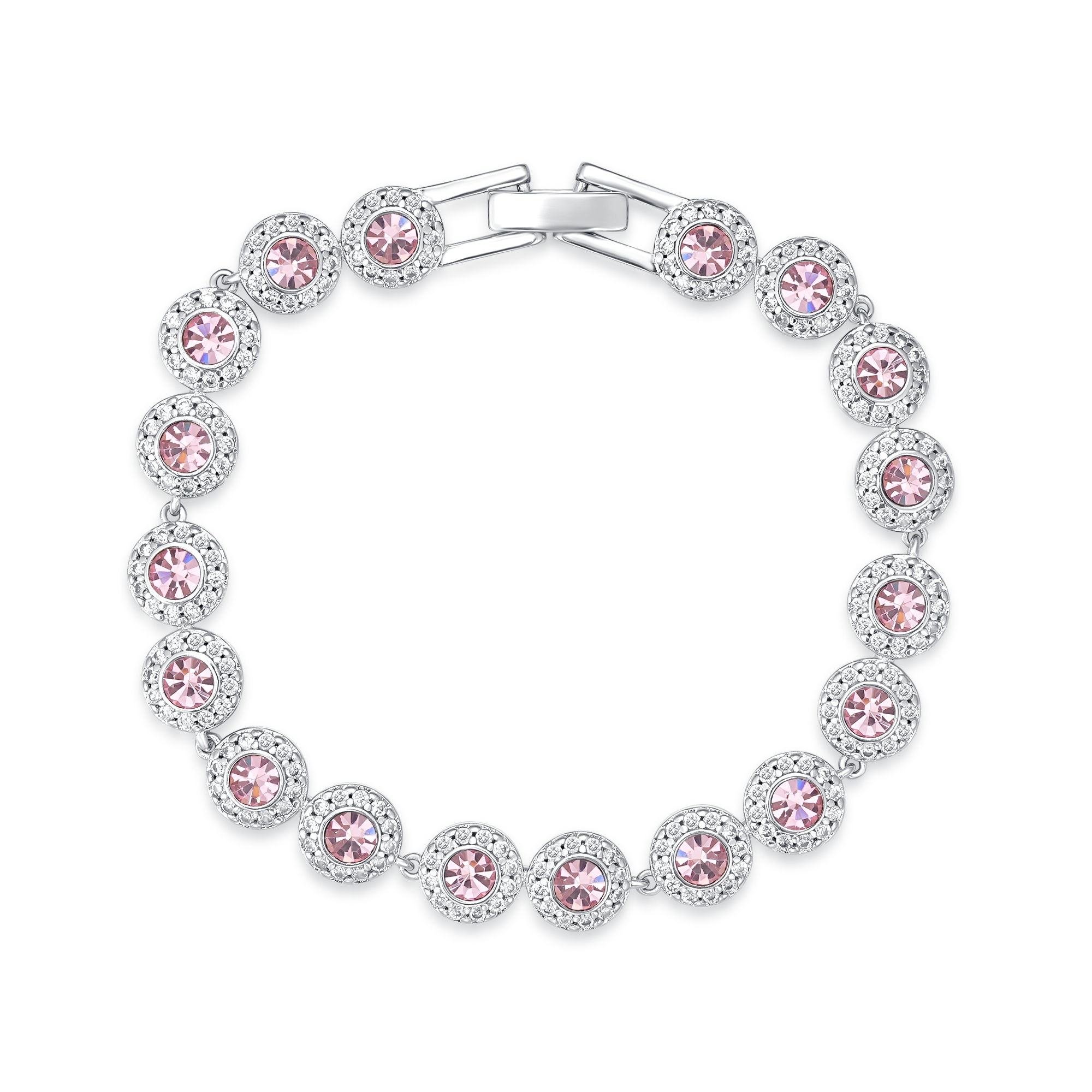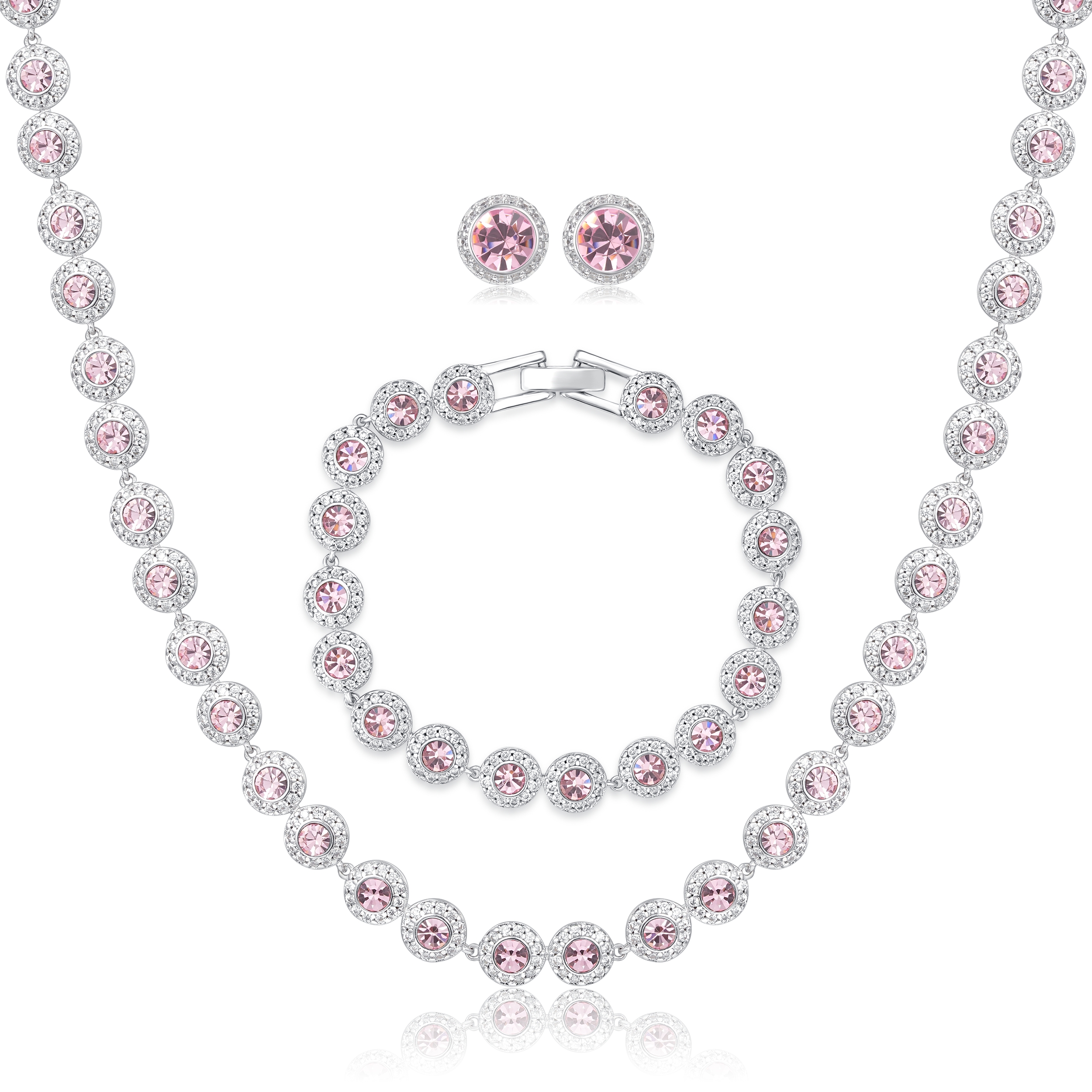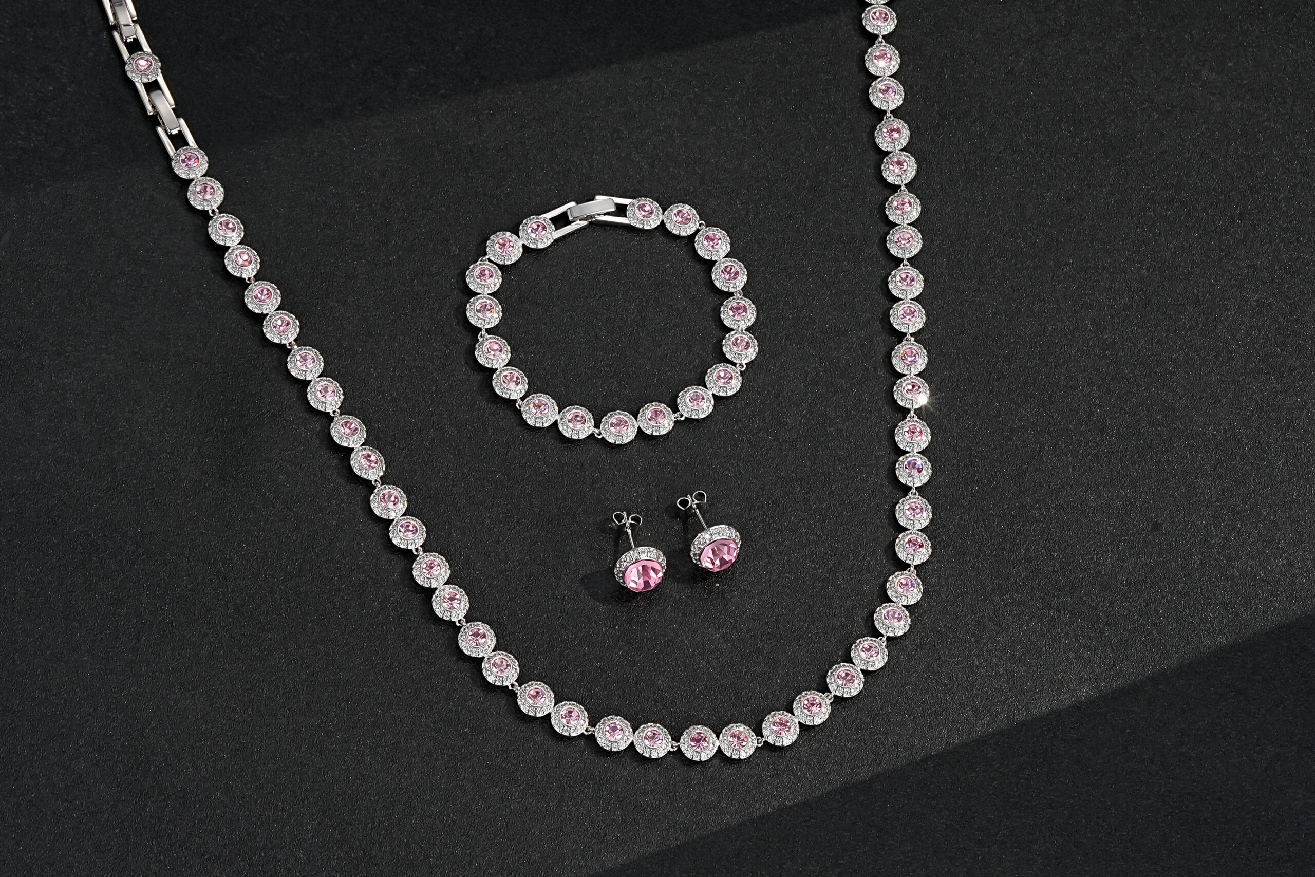 Brighten up your ensemble with this Pink Crystal Halo Tennis Necklace Set. Featuring radiant pink crystals framed by sparkling halos of clear stones, this set brings elegance and charm to any occasion. The matching necklace, bracelet, and earrings offer a polished, coordinated look, making it ideal for both day-to-night transitions and special events.