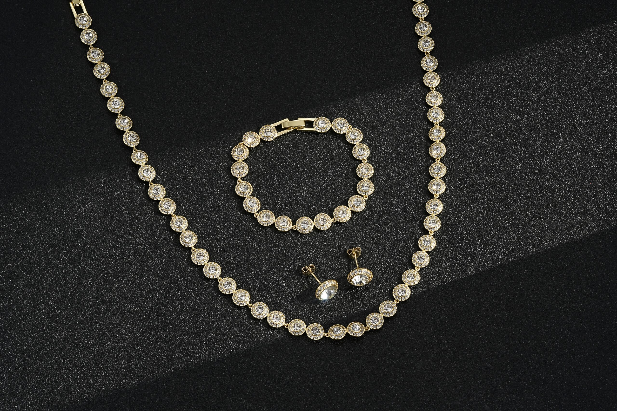 Crafted with meticulous attention to detail, the radiant white stones are elegantly set in premium gold, exuding sophistication and timeless beauty. This set is ideal for special occasions or as a statement accessory for everyday wear, ensuring unparalleled quality and style.