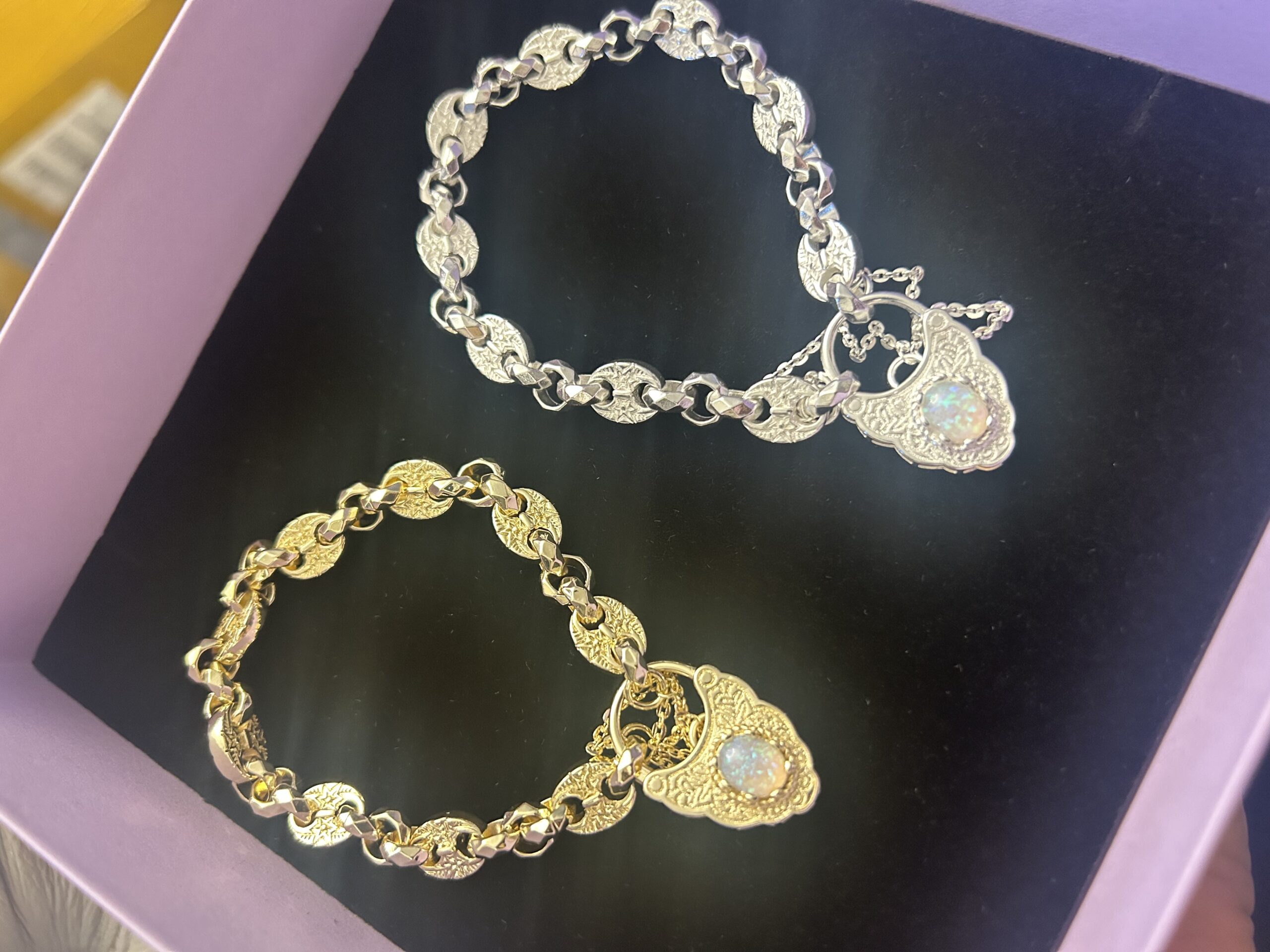 - Intricate chain-link design with a radiant opal button charm
