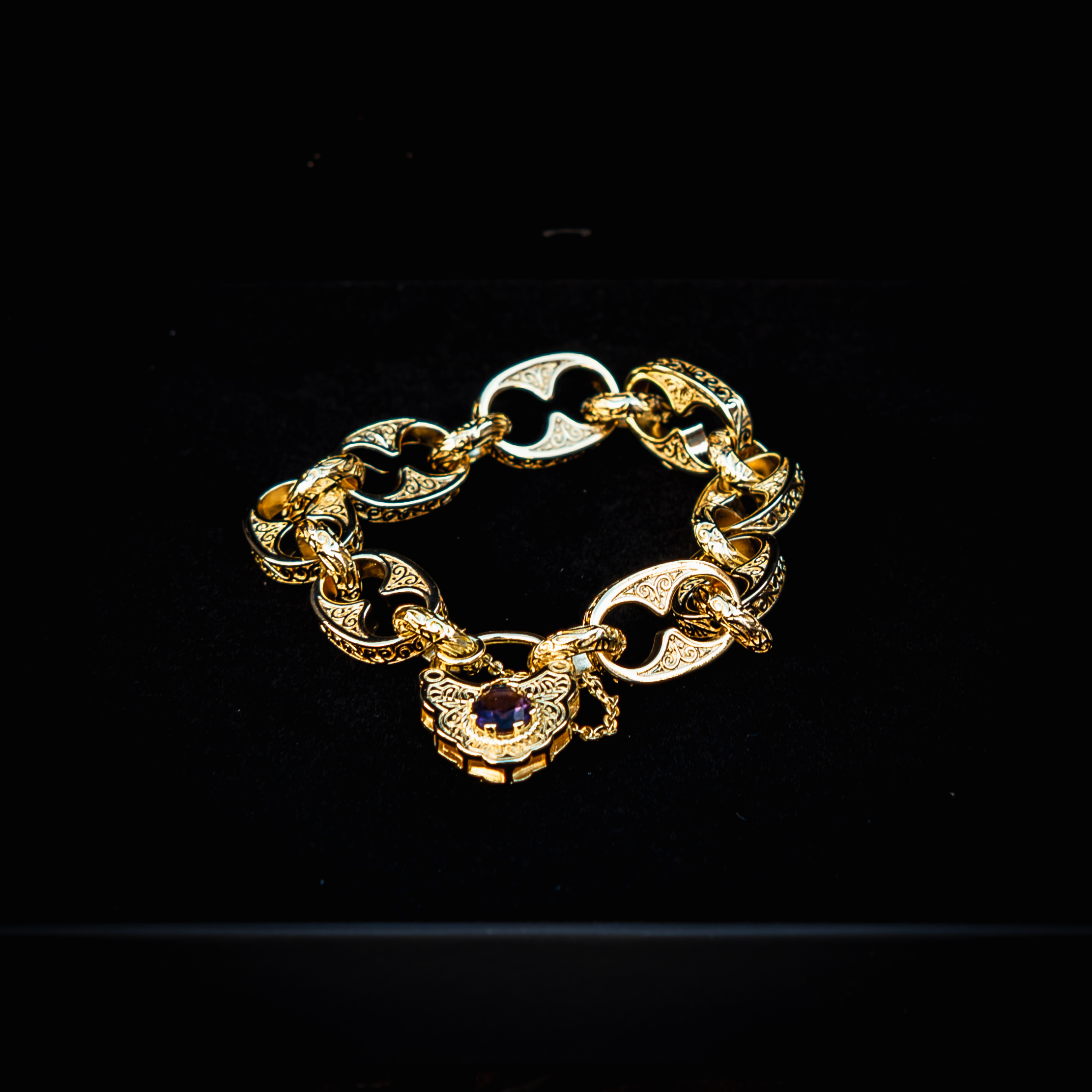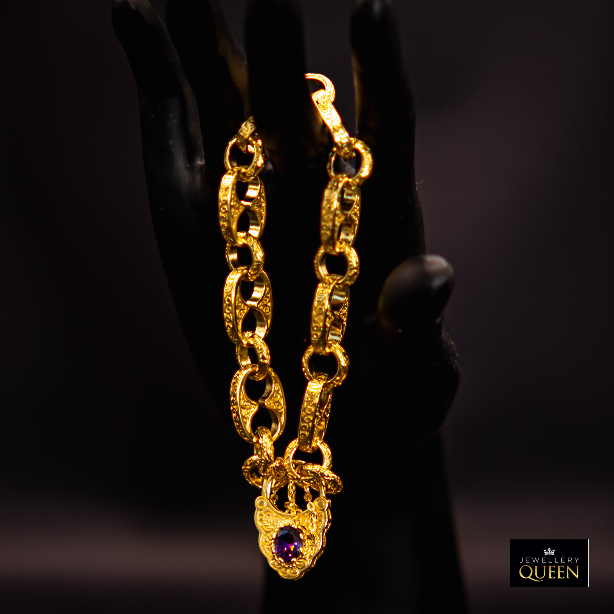 Add a regal touch to your accessory collection with the Premium Gold-Filled Vintage Gold Button Lock Bracelet featuring a striking purple stone. The intricate button lock design, combined with the rich gold-filled finish, creates a perfect blend of vintage charm and modern elegance. This bracelet, adorned with a luxurious purple stone, exudes sophistication and is ideal for both special occasions and elevating your everyday style.