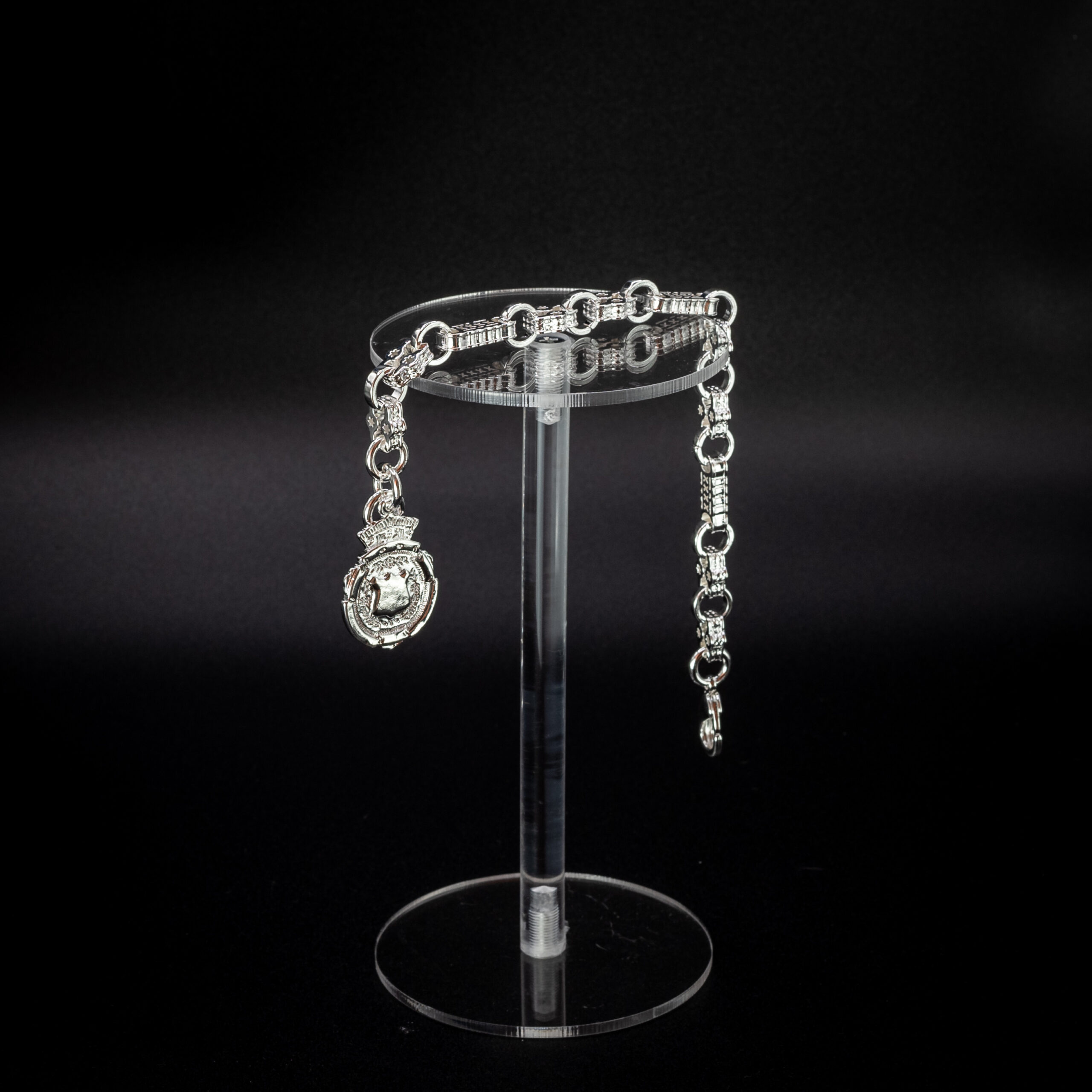 Elevate your style with this luxurious platinum-plated bracelet featuring a 7mm medium stars and bars design. The piece is completed with a distinctive shield pendant, adding a touch of sophistication and charm. The intricate craftsmanship and polished finish make it perfect for both formal and casual occasions, offering a timeless appeal.