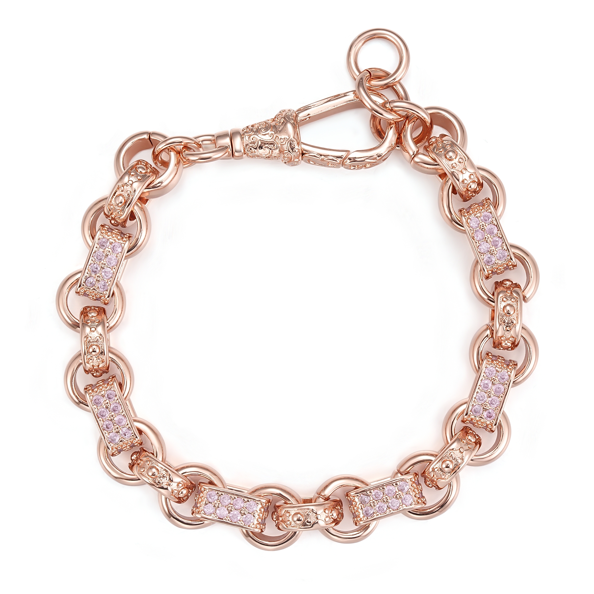 This luxurious rose gold-filled bracelet features a stunning gypsy-inspired design, accented with delicate pink details for a touch of feminine elegance. The intricate textured links and radiant rose gold finish create a sophisticated and eye-catching accessory that elevates any look.