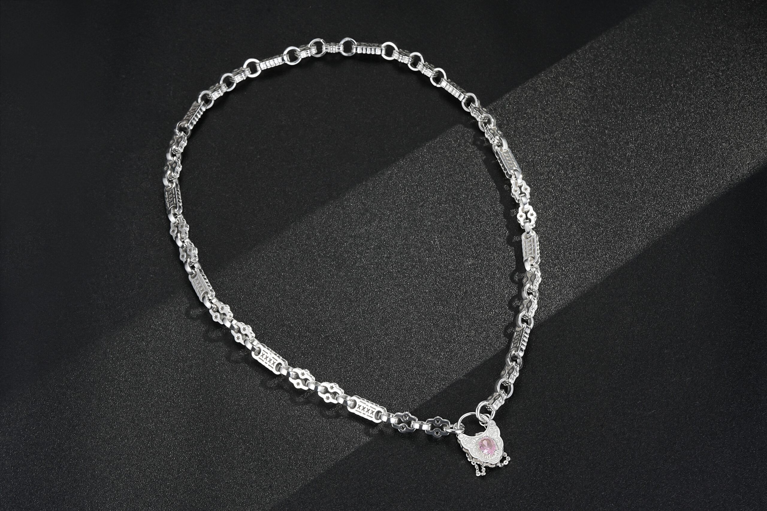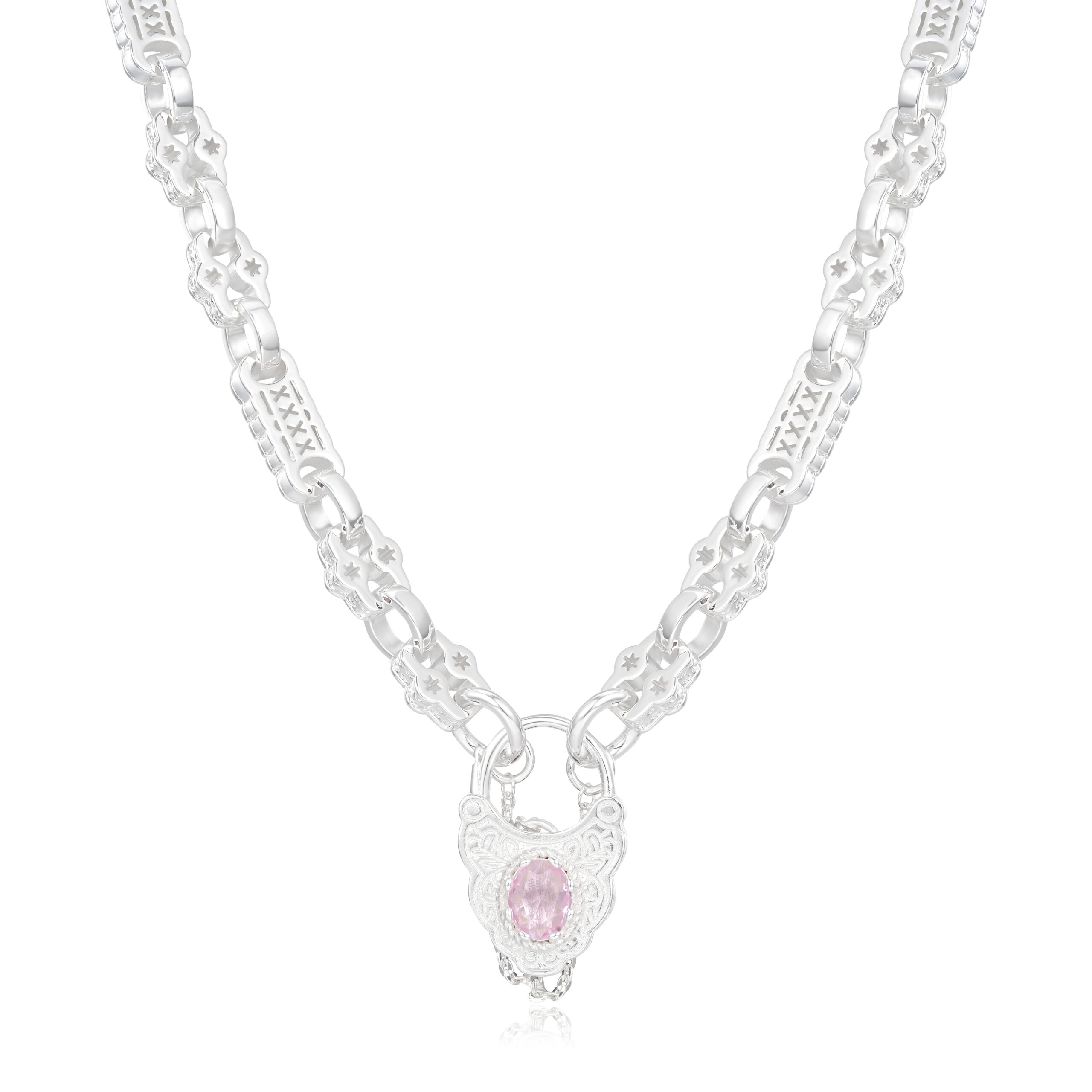 This exquisite necklace features a stunning stars and bars design, beautifully complemented by a charming pink lock pendant. Crafted with precision and finished with rhodium plating, this piece exudes modern elegance and sophistication.