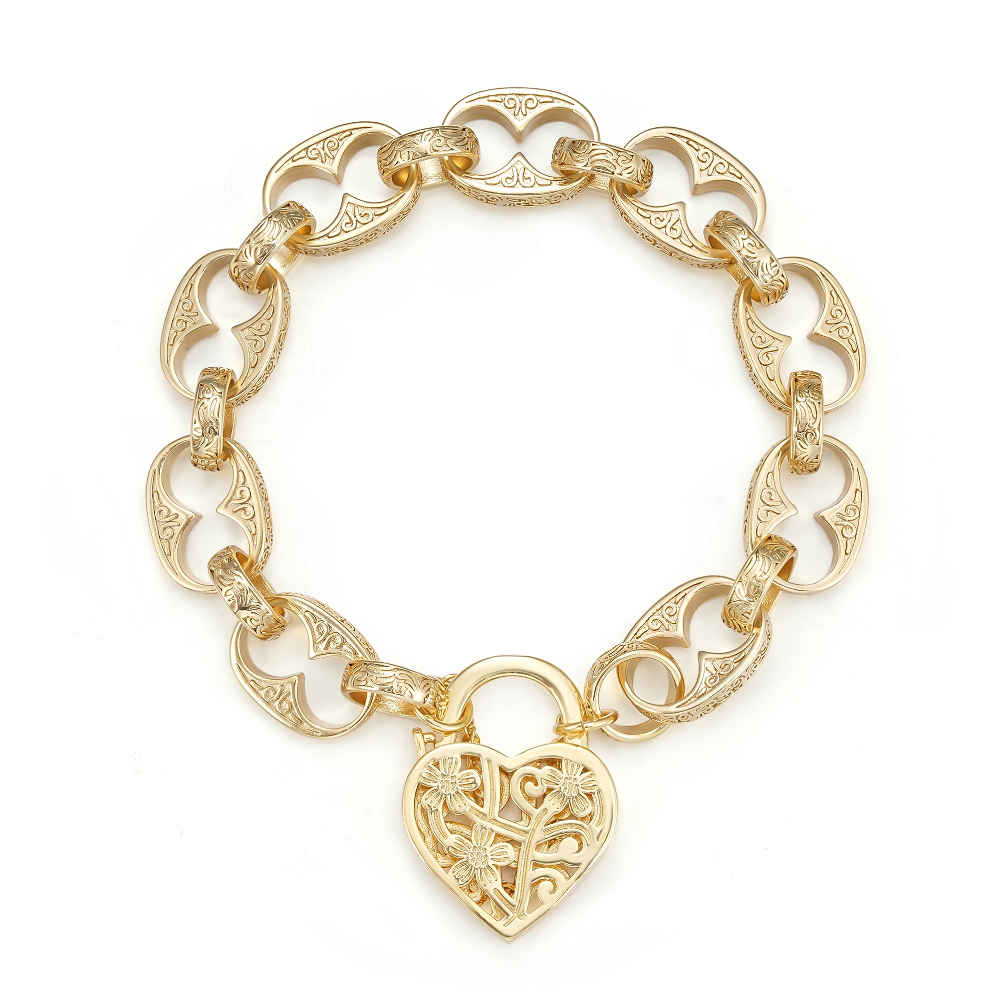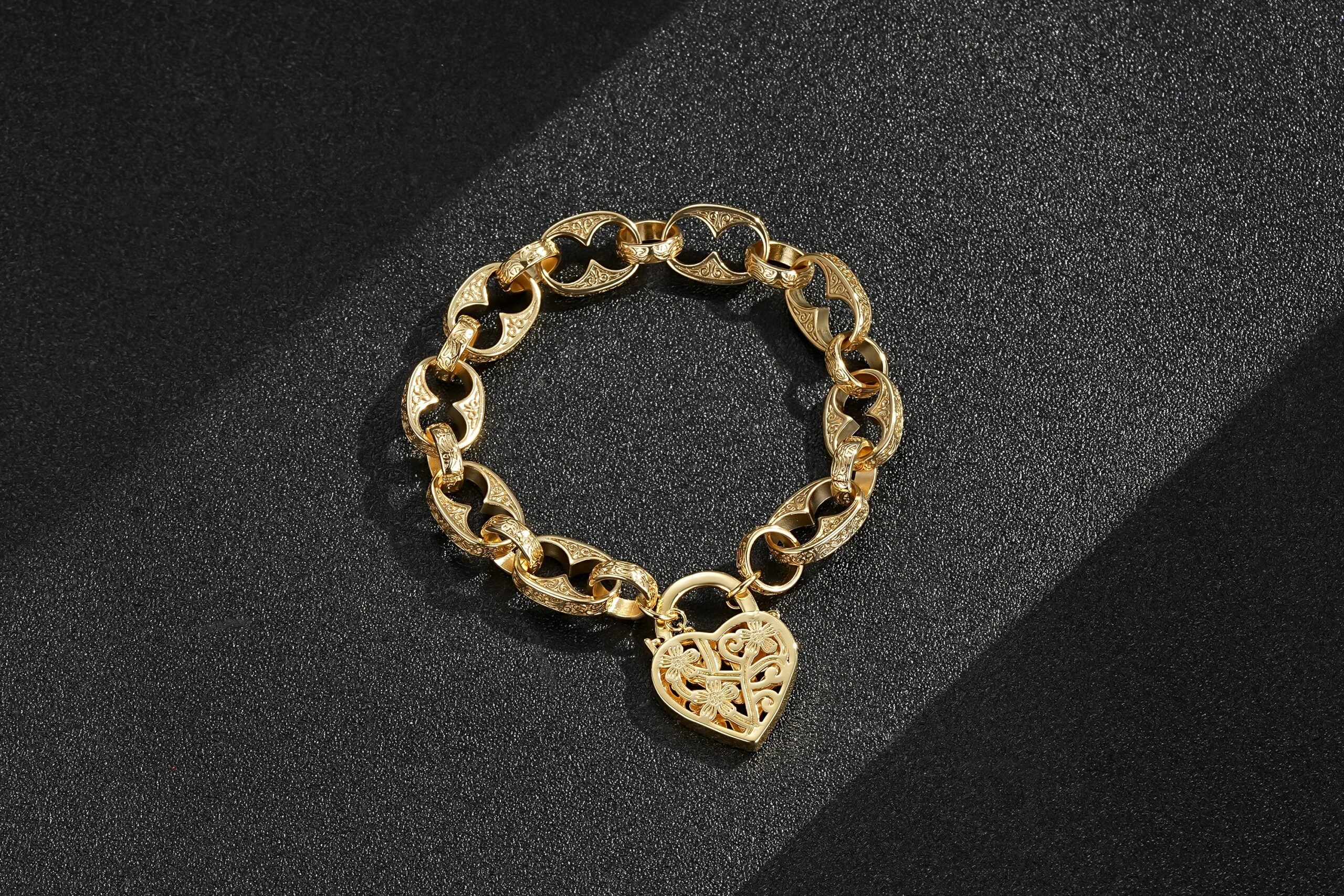The bold yet graceful links create a sophisticated silhouette, while the intricately detailed heart-shaped lock adds a touch of romance and nostalgia. Designed with premium gold-filled material, this bracelet offers a radiant finish and exceptional durability, making it perfect for everyday wear or as a standout accessory for special occasions. A versatile piece that exudes luxury and craftsmanship, it’s an essential addition to any jewellery collection.