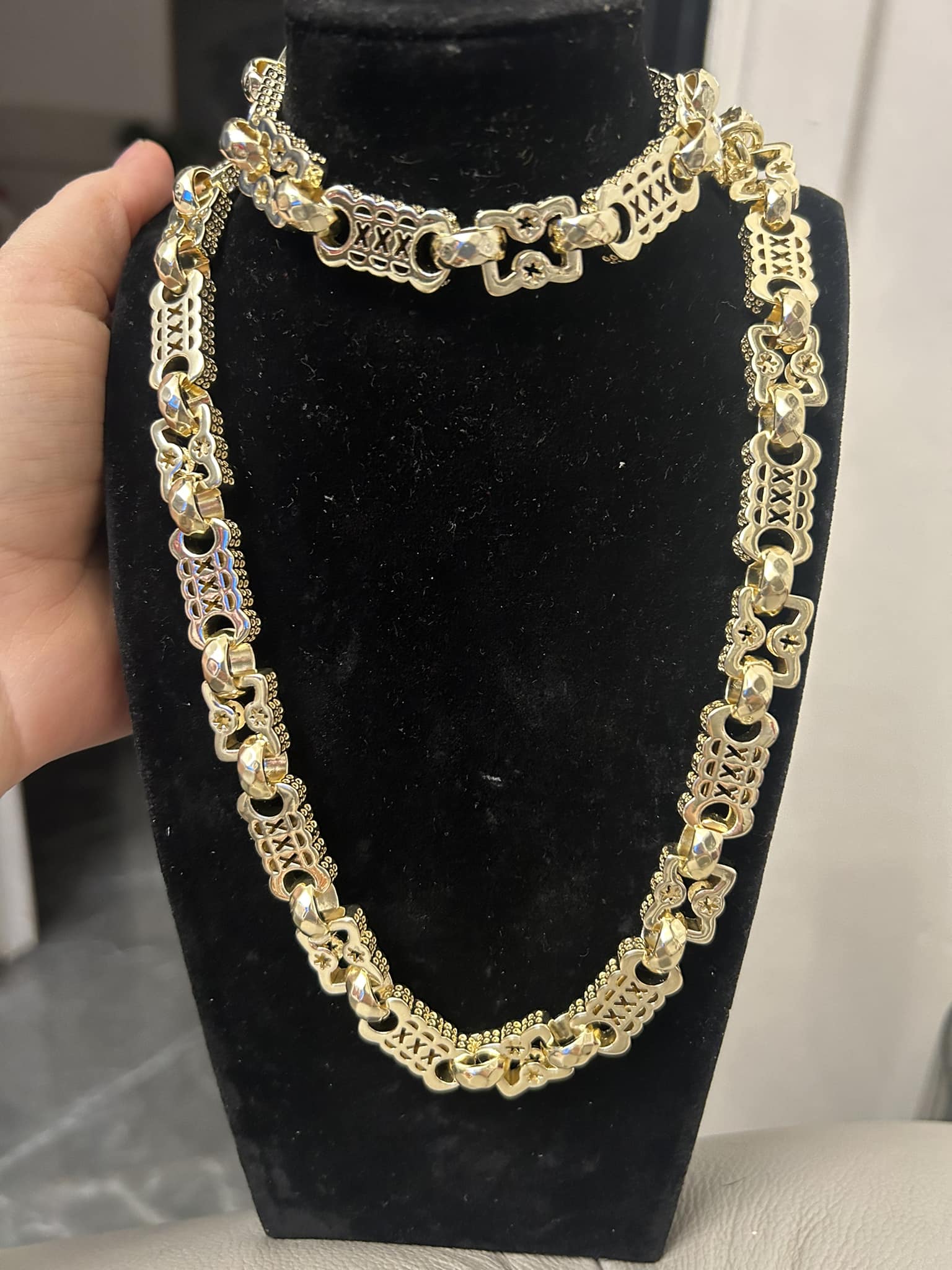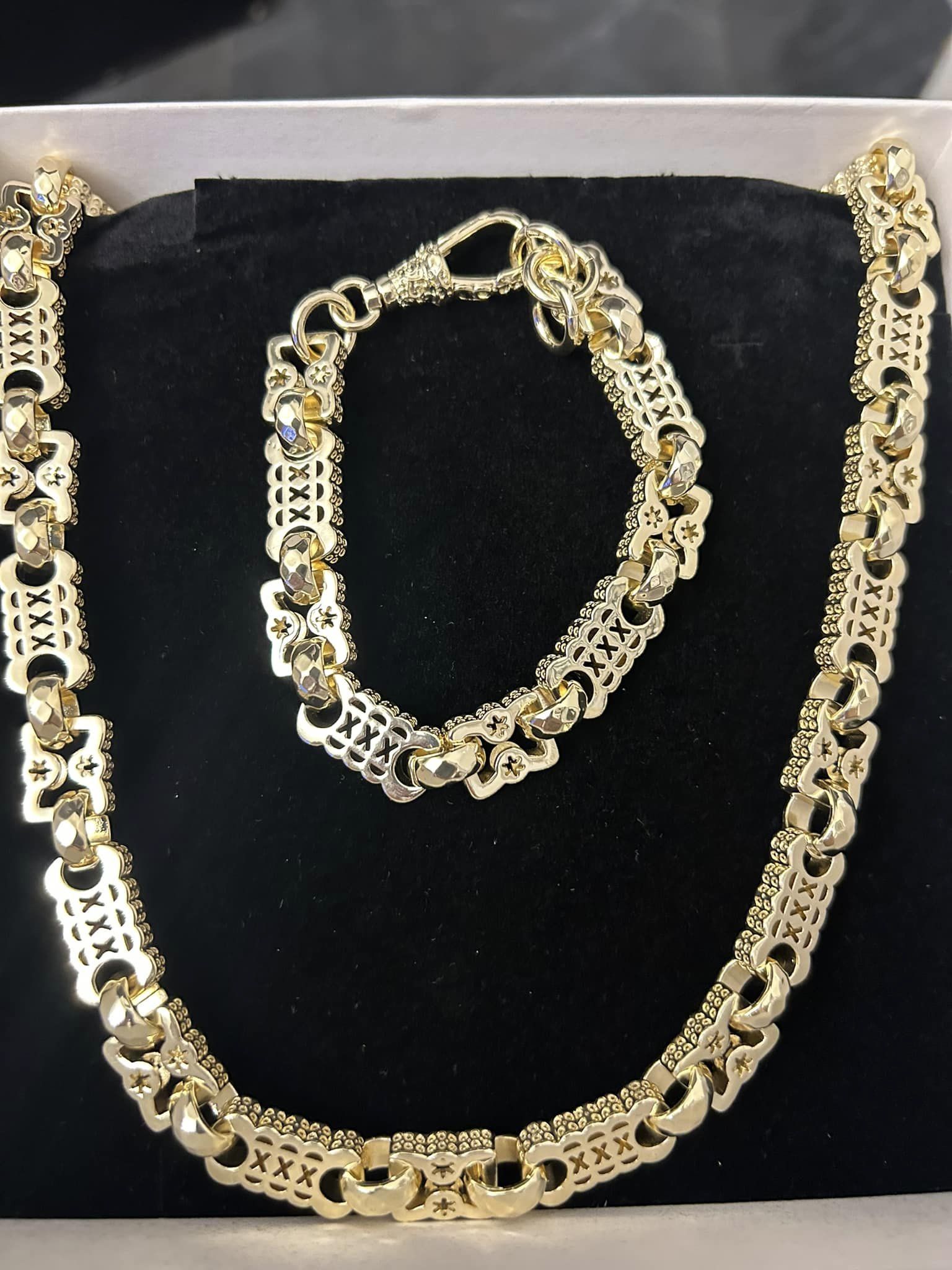 This elegant gold-filled set features a unique stars and bars design with smooth and intricate half-patterned links, perfect for those who love bold yet refined jewellery. Ideal for statement occasions or everyday wear, the set includes a necklace and bracelet that seamlessly blend style with practicality.