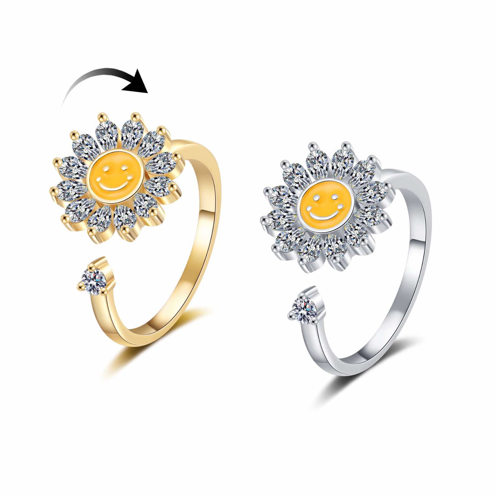 Add a playful yet elegant touch to your jewellery collection with these innovative Fidget Spinner Rings. Designed with a spinning sunflower motif featuring a cheerful smiley face, these rings combine fun functionality with dazzling style. Adjustable in size for the perfect fit, they are crafted with high-quality materials to ensure long-lasting durability and shine. Perfect for stress relief or as a unique fashion statement.