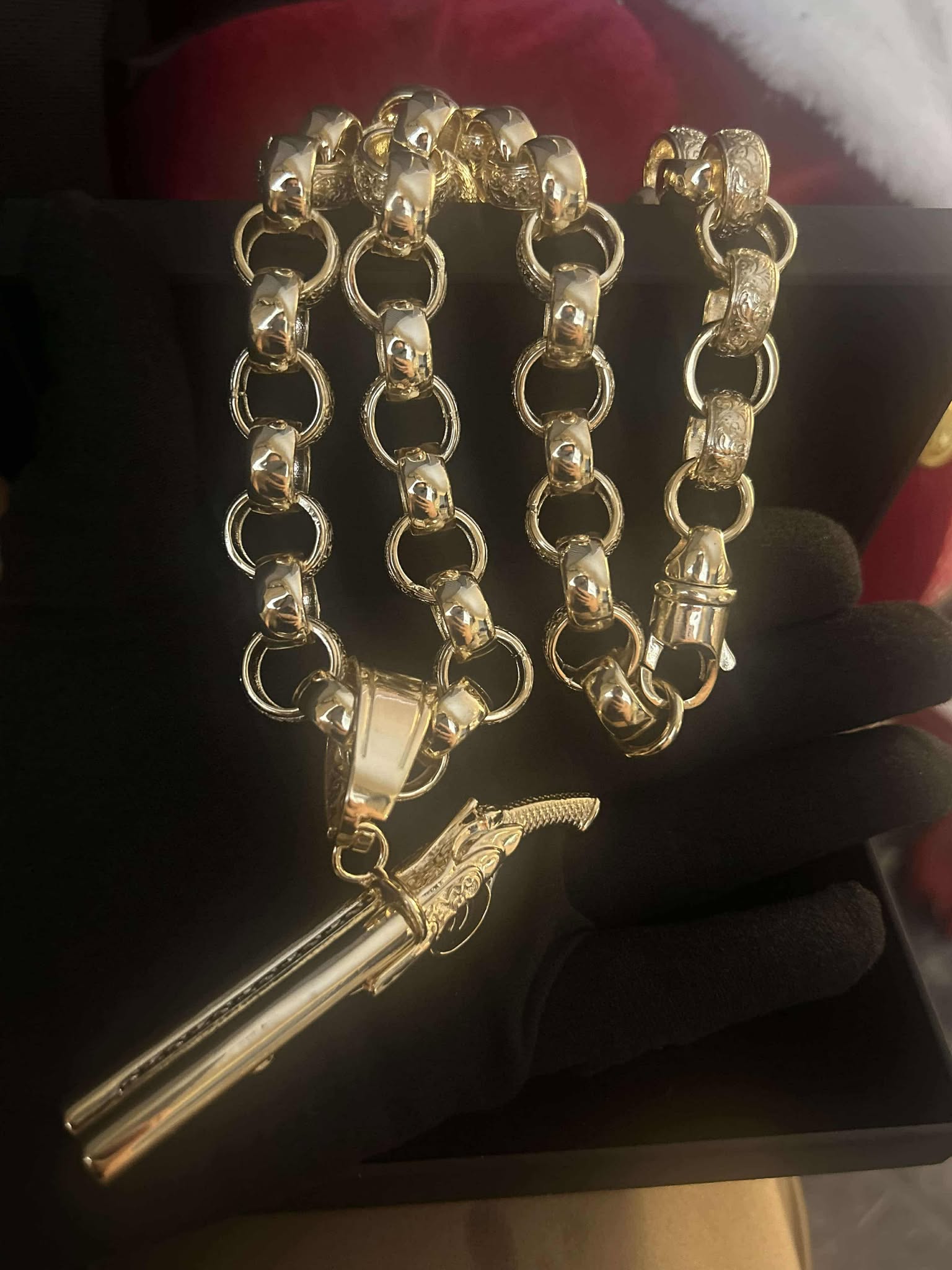 - Features a striking shotgun pendant with detailed craftsmanship, adding a unique and edgy statement to the piece.